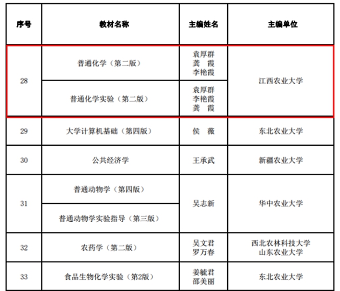 根据《全国农业教育优秀教材资助项目评选办法》(基金会〔2020〕15号)和《中华农业科教基金会关于开展2023年全国农业教育优秀教材资助项目评选工作的通知》(基金会〔2023〕7号)要求,经学院组织申报,学校推荐,全国农业教育优秀教材评选委员会专家组评选,中华农业科教基金会审核确定,于2023年12月20日公布了全国农业教育优秀教材评选结果,我校共3部教材获奖,爱游戏ayx官网有2部。爱游戏ayx官网袁厚群、龚霞、李艳霞主编的《普通化学》教材和《普通化学实验》教材获评全国高等农业院校优秀教材。