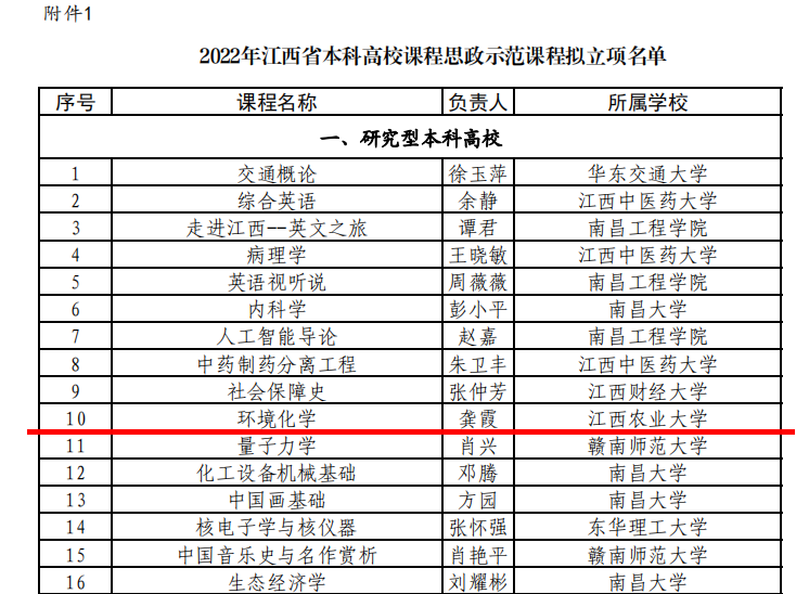 2022年12月,根据省教育厅《关于开展课程思政示范项目建设工作的通知》,经学校审核推荐,省教育厅组织专家网络评审,我校获批2项2022年本科高校课程思政示范课程(教学名师、教学团队),爱游戏ayx官网龚霞教授的“环境化学”课程和教学团队被立项为江西省课程思政示范课程、教学名师和教学团队。
