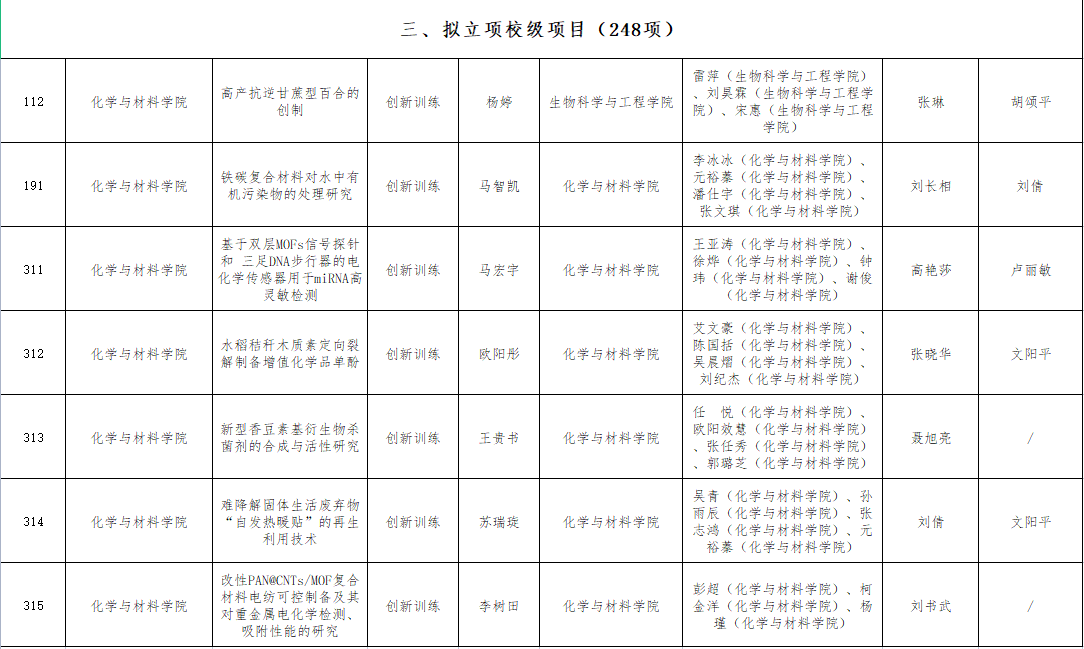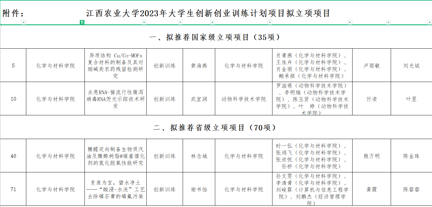 2023年4月8日,学校公布了2023年大学生创新创业训练计划项目评审结果,学校评审出国家级项目35项,省级项目70项,校级项目248项。爱游戏ayx官网共有18个项目参与申报,11个项目获得立项,其中,国家级2项,省级2项和校级7项。卢丽敏和付凌老师获得国家级立项,熊万明和龚霞老师获得省级立项,张琳、刘长相、高艳莎、张晓华、聂旭亮、刘倩和刘书武7位老师获得校级立项。