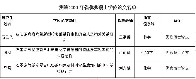 近日,江西省学位办公布了2021年全省优秀博士硕士论文入选名单,爱游戏ayx官网王宗德教授、卢丽敏教授、刘光斌副研究员分别指导的研究生石云飞同学、谢羽同学、马雪同学的学位论文入选为江西省优秀硕士学位论文。这充分体现了爱游戏ayx官网注重研究生培养过程管理,加强研究生学位论文质量建设,切实保障了硕士学位论文质量。
