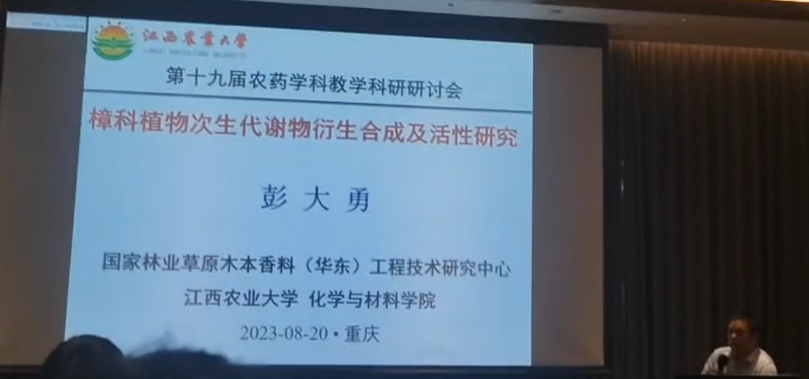 彭大勇副教授、木本香料(华东)工程技术中心研究生黄聪、爱游戏ayx官方网站研究生王杰、肖淑珍等现场参会交流学习。彭大勇副教授在杀虫剂/杀螨剂科研学术报告会上做了“樟科植物次生代谢产物衍生合成及活性研究”的报告,并获得 “农药学科优秀中青年科技工作者”奖。通过本次会议,加强了爱游戏ayx官网与其他高校的学术交流,进一步提升了爱游戏ayx官网的科研活力。