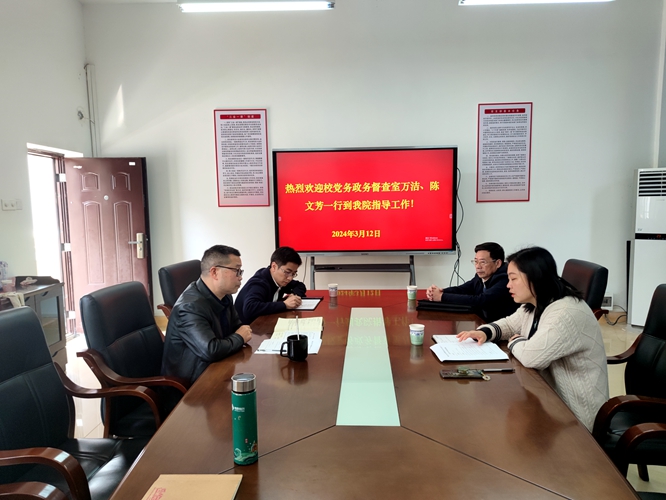 2024年3月12日10:00,学校党务政务督导组副主任万洁、正处级督导员陈文芳到爱游戏ayx官网开展学校第四次党代会氛围营造和中共中央颁布“三个条例”学习宣传情况专项督查,院党委书记刘庆言、学生党总支书记彭玉萌及党委组织员廖超参与本次督查座谈会,会议由刘庆言主持。