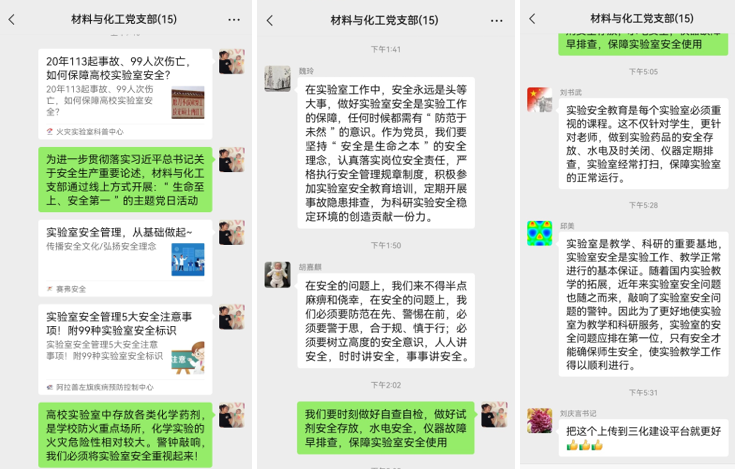 随着我校教学科研综合实力的逐步提升,无论从实验室数量上还是科研硬件上都有很大的发展。为了更好的使实验室为教学和科研服务,保障实验室安全,材料与化工支部党员于6月30日共同研讨了实验室安全管理问题,明确了实验室安全管理责任人的具体职责,部分党员实验室的安全责任人签署了“化学与材料学院实验室安全管理责任书”,积极为爱游戏ayx官网实验室的安全管理贡献自己的力量。7月1日,通过线上方式,支部书记刘倩结合高校实验室的特殊性展示了实验室安全管理面对的严峻形势,强调实验室安全管理的重要性和必要性,进一步确立了“生命至上、安全第一”的安全文化建设理念。支部党员均表示要提高认识、多做预防、把实验室安全工作做好做实。