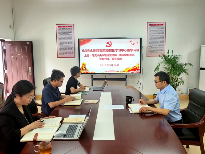 2025年5月26日8:30,学院党委理论学习中心组召开学习会,以“落实中央八项规定精神,确保学有质量、查有力度、改有成效”为主题,开展深入贯彻中央八项规定精神学习教育集体学习。全体党委委员参会,副院长、九三学社社员龚霞、学生党总支书记彭玉萌列席会议,会议由学院党委书记刘庆言主持。