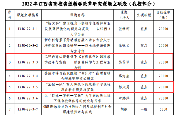 2023324日,学校公布了2022年教学改革研究课题评审结果,爱游戏ayx官方网站获批省级立项课题26项,校级课程思政教研专项课题立项14项,校级教学改革研究课题立项50项。爱游戏ayx官网共获得立项项目9项,其中吴苏琴和彭大勇两位老师均获得省级重点课题立项,胡嘉麒老师获得课程思政专项立项,邱美、龚霞、卢丽敏、谢琰玉、龙小艺、魏玲6位老师获得校级课题立项。