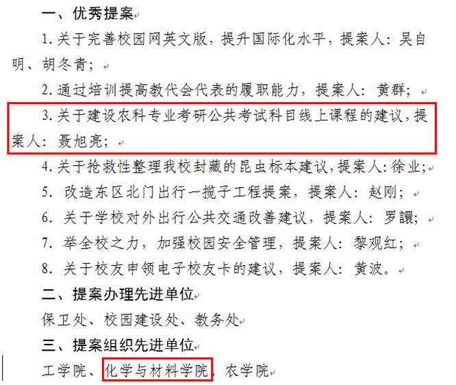 爱游戏ayx官网党政领导历年来都非常重视“双代会”提案工作,要求每位“双代会”的代表们至少提出一个提案,要求“双代会”的代表们以高度的主人翁意识,充分行使职权,切实履行职责,深入调查研究,广泛征求意见,就学校发展重大问题和涉及师生切身利益的实际问题积极建言献策,助推学校事业健康持续发展。2023年爱游戏ayx官网“双代会”代表们共提交7份优质提案,聂旭亮代表提出的“关于建设农科专业考研公共考试科目线上课程的提案”的提案获评优秀提案,学院分工会获评提案组织先进单位。