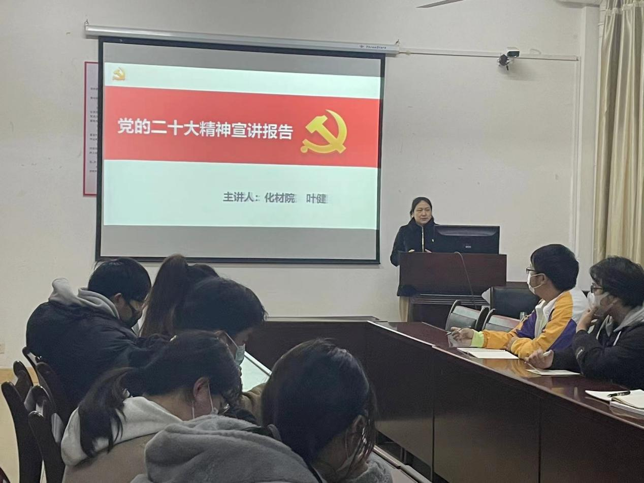 叶健详细解读了习近平总书记在党的二十大中的报告,带领在座学生干部认真学习领会了党的二十大精神的九个方面。她强调,青年学生要充分认识党的二十大重要意义,要切实将思想认识和实践行动统一到党的二十大精神上来,学好专业知识,强化担当意识,锻炼过硬本领,结合新时代与时俱进全面发展,努力成长为敢当大任、堪当大任、能当大任的新时代青年大学生。