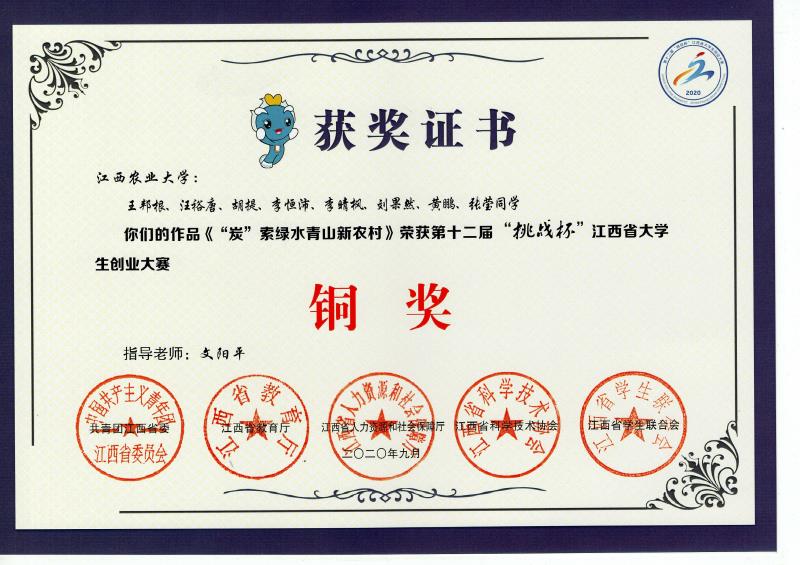 爱游戏ayx官网应化1701班王上源同学设计的项目《生存有道——基于小学生综合实践课的教育培训服务》和应化1703班王邦根同学设计的项目《“炭”索绿水青山新农村》双双荣获省级铜奖。此外,爱游戏ayx官网学生在爱游戏ayx官方网站第十届大学生创业计划竞赛暨2020年“挑战杯”大学生创业大赛校内选拔赛中表现优异,荣获校级一等奖、二等奖、三等奖、优胜奖各一项,学院获评校优秀组织奖。