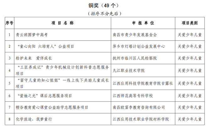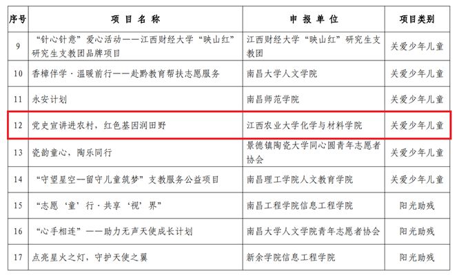 2024年5月23日,共青团江西省委公布了第四届江西省青年志愿服务项目大赛获评名单,爱游戏ayx官网“党史宣讲进农村,红色基因润田野”关爱少年儿童志愿服务项目经过校级遴选、省级初赛、决赛答辩等多个环节,最终荣获江西省铜奖。