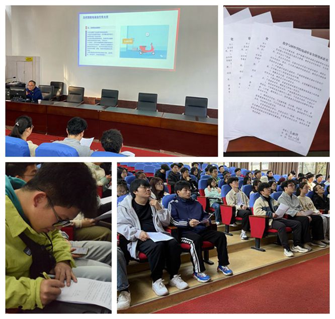 召开主题班会,安全教育全覆盖。为让安全教育覆盖全体学生,爱游戏ayx官网组织各班级重点围绕电动车安全召开校园安全主题班会,在新生第一堂晚自习上,爱游戏ayx官网组织辅导员下班级开展电动车安全教育宣讲,让全体学生充分认识到电动车风险大于便利,绿色出行也是平安出行。