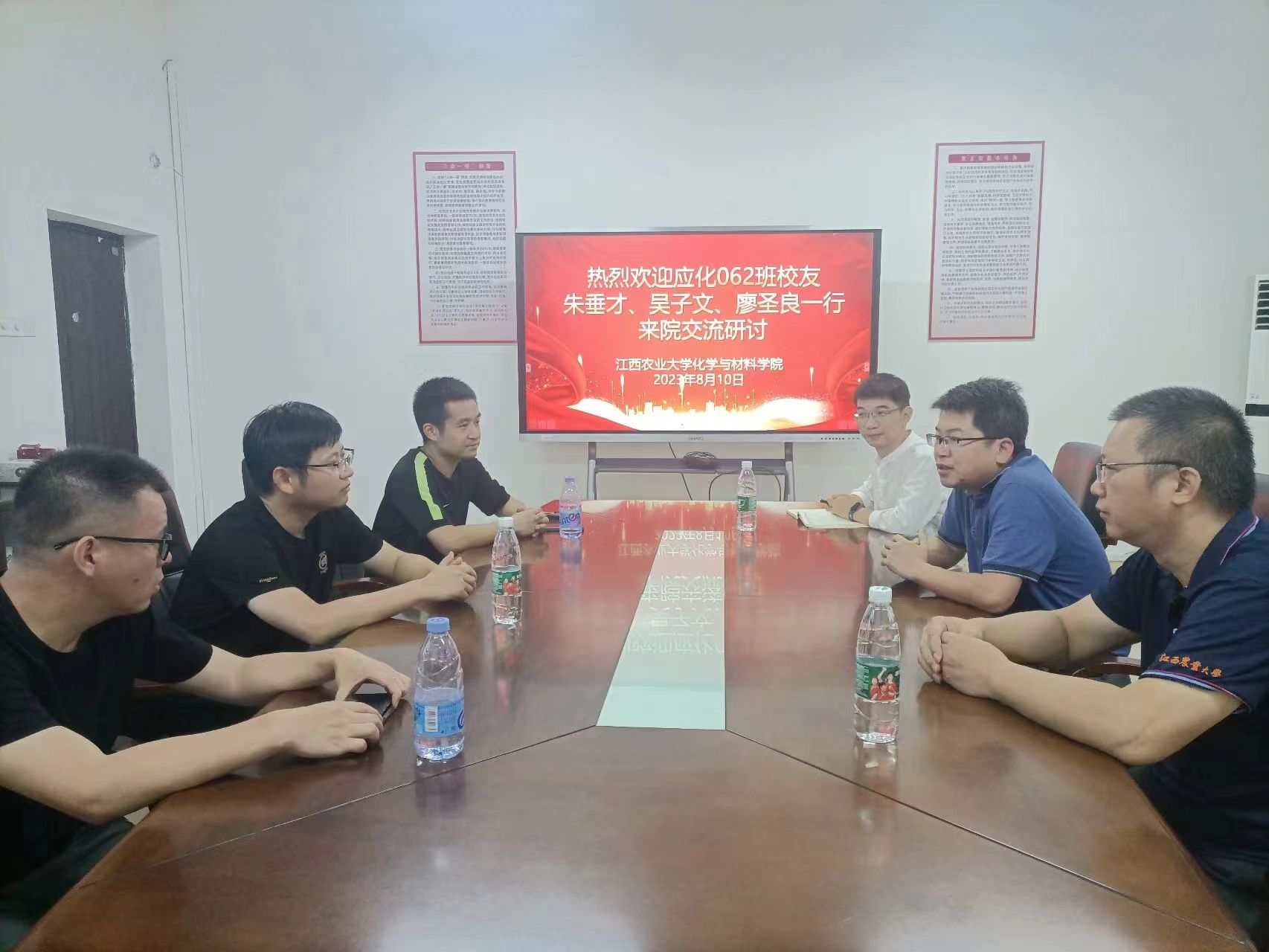 810日,应化062班校友美的集团总部区域经理朱垂才、青岛贞开生物医药技术有限公司经理吴子文、江西省农科院助理研究员袁丽娟、爱游戏ayx官方网站林学院副研究员廖圣良等5位校友回学院开展交流。学院副院长卢丽敏、团委书记冷飞翔和办公室吴奎主任热情接见了5位校友。任课教师代表黄喜根、彭大勇等出席了交流会。交流会上,5位校友畅所欲言,感慨母校变迁,回忆校园时代往事,分享了毕业至今个人生活和工作的情况,同时就校友事务、双方交流合作进行了深入交流。学院领导及教师代表对校友们毕业之后所取得的成绩表示祝贺,祝愿校友们未来更美好欢迎校友们有时间常回母校母院交流