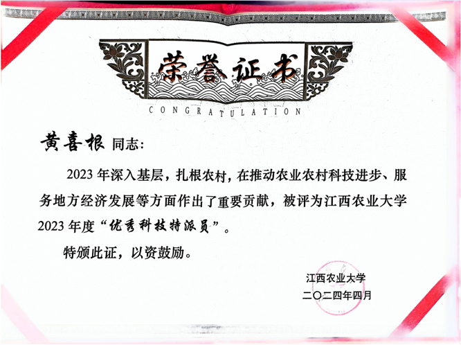 据了解,本次共有20名同志荣获学校2023年度“优秀科技特派员”称号,爱游戏ayx官网黄喜根教授名列其中,这也是黄喜根教授连续第七年荣获此殊荣。