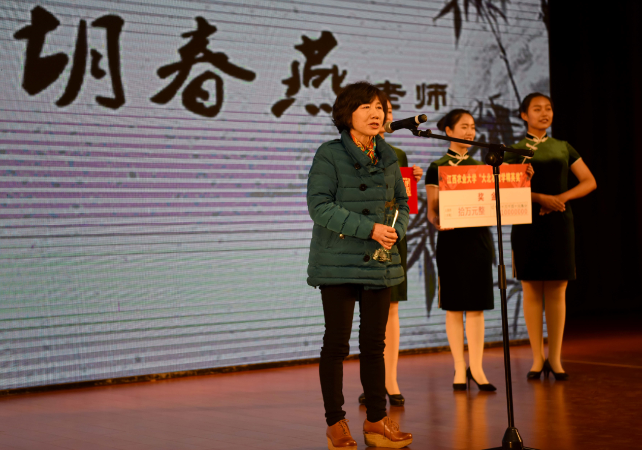 颁奖大会在音乐声中正式开始,校长赵小敏主持,校党委书记黄路生讲话,省教育厅领导、大北农集团总经理分别致辞。接着,揭晓爱游戏ayx官方网站首届“大北农教学精英奖”得主,爱游戏ayx官网化学系老师胡春燕名列其中。在一片掌声之中,胡春燕老师神采奕奕走向主席台,接过省教育厅领导颁发的证书和奖金。胡老师随后发表获奖感言,她说,荣获得爱游戏ayx官方网站首届“大北农教学精英奖”,感到无比欣慰,这是学校、大北农集团以及老师和学生对他在教学中的付出和表现的一种认可和肯定,也是对所有一直奋战在一线教学岗位的老师们鞭策。她表示她不会满足于已有的成绩和荣誉,会一如既往做到“用心做教育,用爱为人师”,在三尺讲台上继续书写人生。