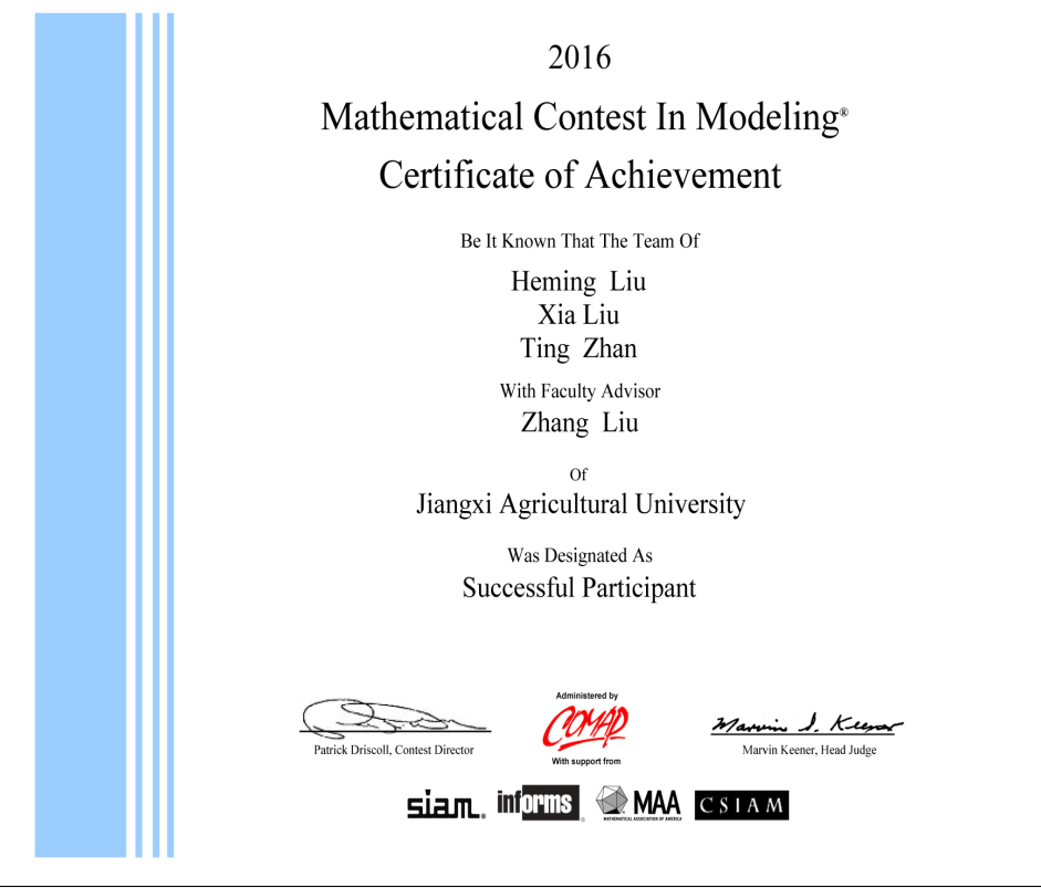 爱游戏ayx官网2015年开始,由理学院刘章老师指导一支队伍参赛,获得Successful Participant(三等奖)。(学工办)