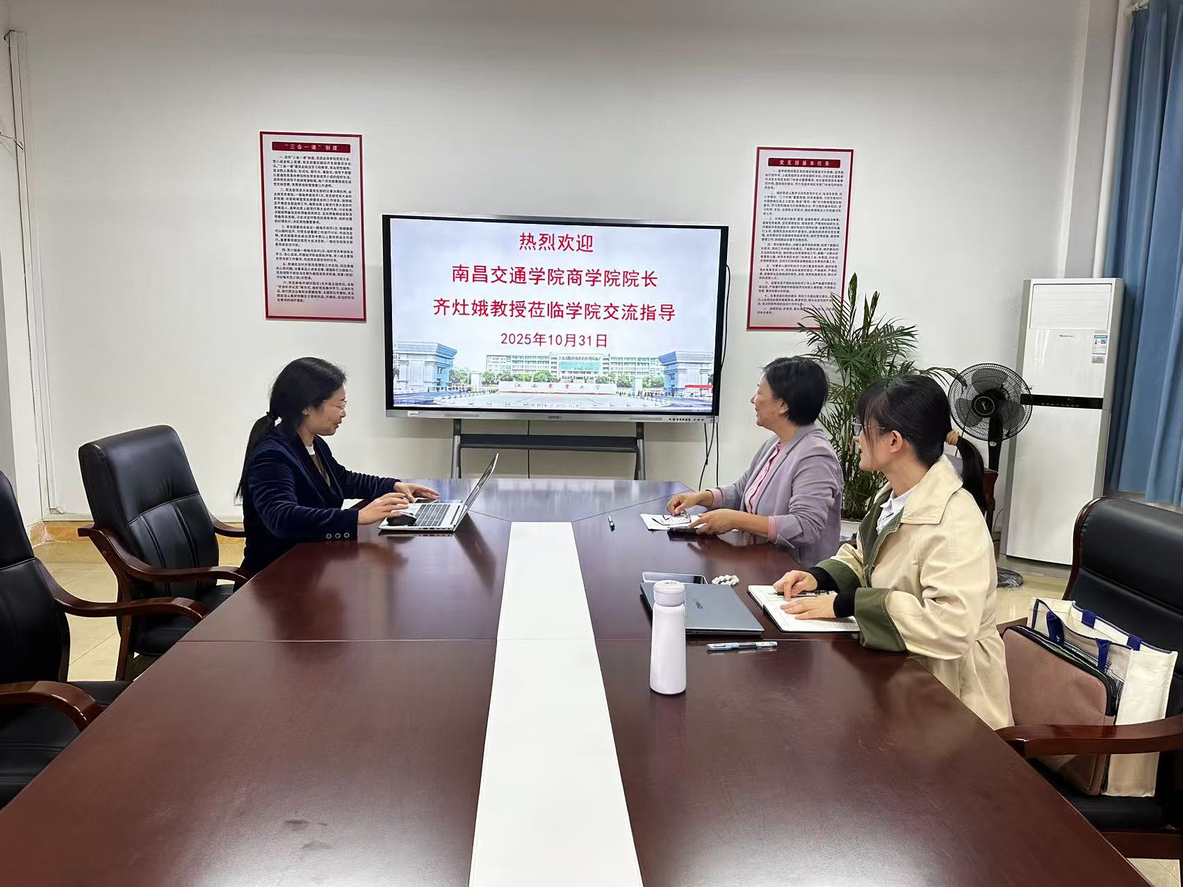 2025年10月31日上午,南昌交通学院商学院院长齐灶娥教授、专业负责人万方晨老师一行莅临爱游戏ayx官网,围绕“教育教学管理与教学成果奖申报”开展专题研讨。学院副院长龚霞全程参与,双方以问题为导向,展开深度对话与经验互鉴。