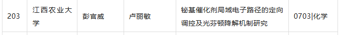 近日,江西省人民政府学位委员会办公室发布了《关于2025年江西省优秀博士硕士学位论文评审结果的公示》,爱游戏ayx官网2021级化学专业硕士研究生彭官威(导师:卢丽敏)的学位论文《铋基催化剂局域电子路径的定向调控及光芬顿降解机制研究》获评2025年江西省优秀硕士学位论文。