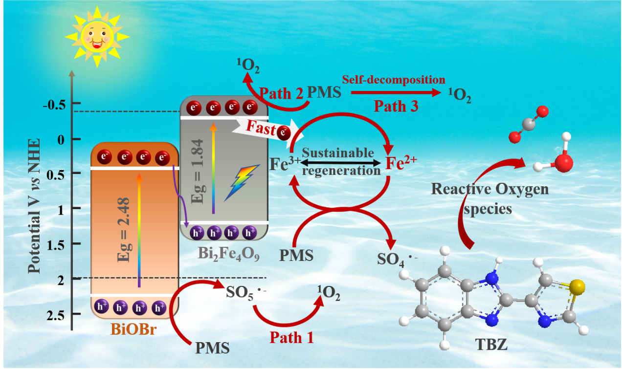 该论文构建了Bi2Fe4O9/BiOBr S型异质结,在可见光下和PMS的协同作用下降解噻菌灵。其中,Bi2Fe4O9和BiOBr具有相似的[Bi2O2]2+结构单元,共享Bi-O键,有利于形成不对称界面,增强极化。基于Bi2Fe4O9和BiOBr之间的这些独特特性,在S型异质结中建立了一个强大的内部电场,该电场可以为促进电子转移过程和Fe2+的可持续再生提供驱动力,从而实现了噻菌灵的快速降解和较低的铁离子浸出。